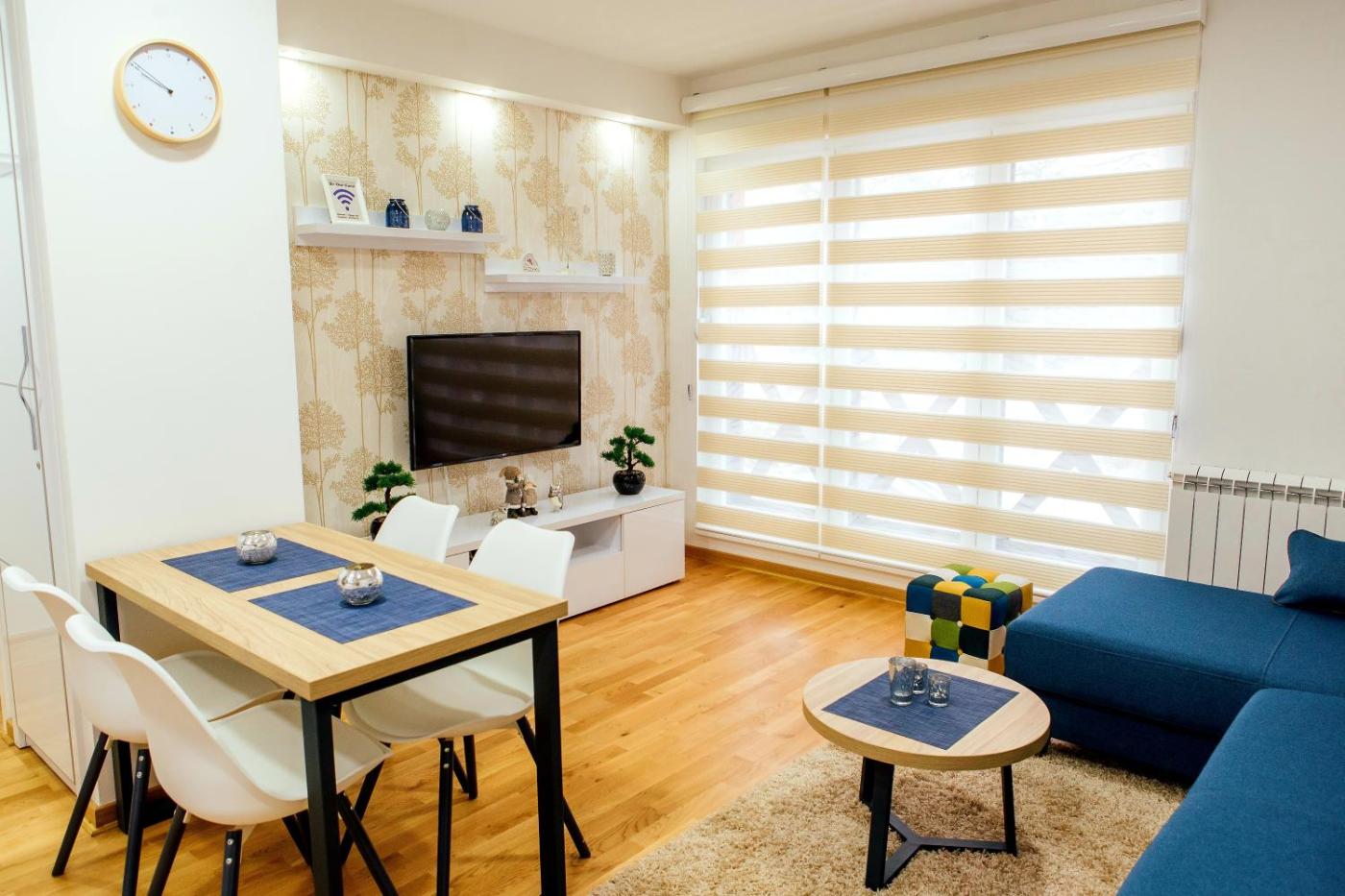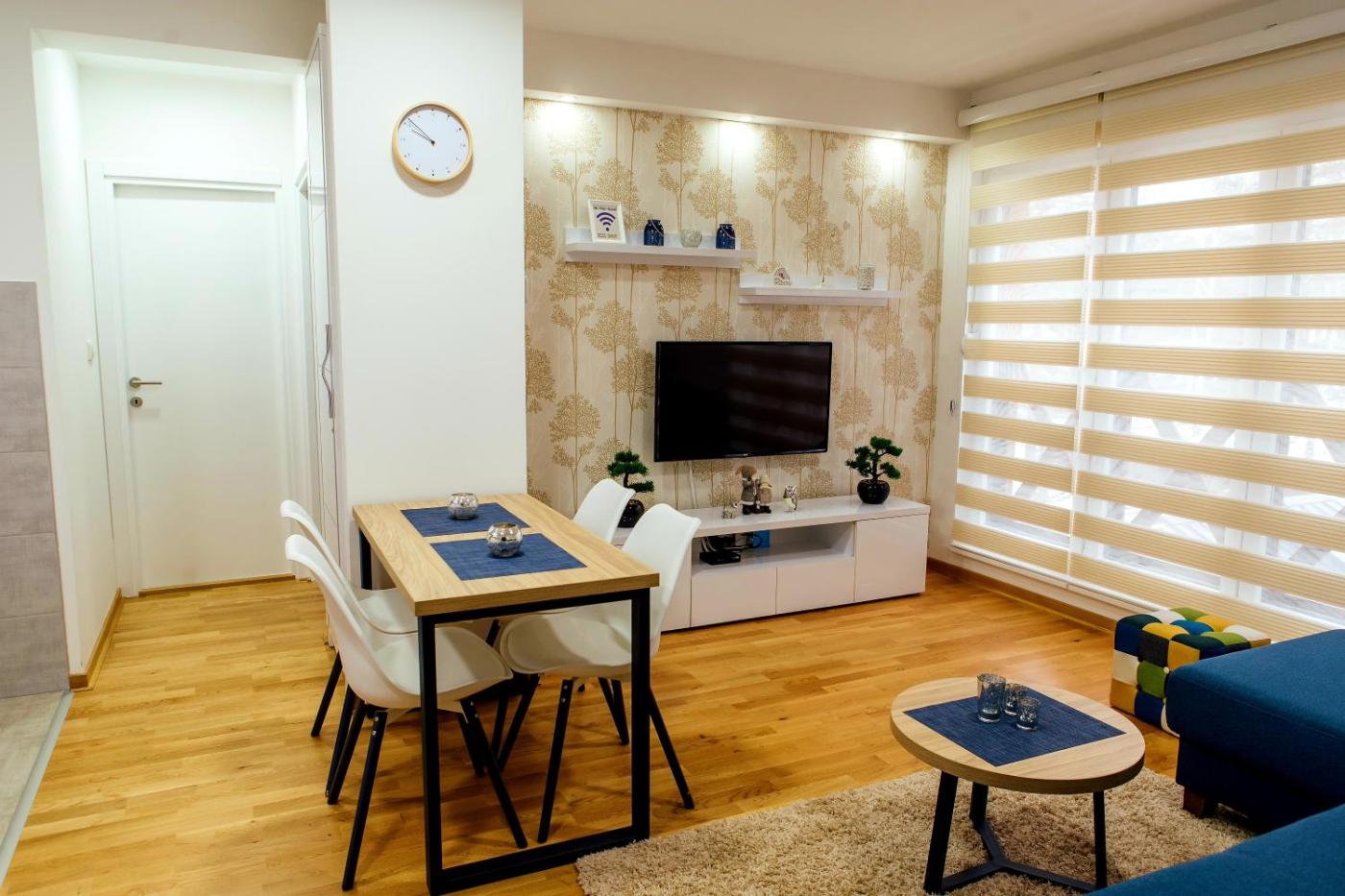 One-Bedroom Apartment. This apartment comes with 1 living room, 1 separate bedroom and 1 bathroom with a walk-in shower and free toiletries. In the kitchen, guests will find a stovetop, a refrigerator, kitchenware and an oven. The apartment features a washing machine, a seating area, a dining area, a flat-screen TV with cable channels, as well as garden views. The unit has 2 beds.